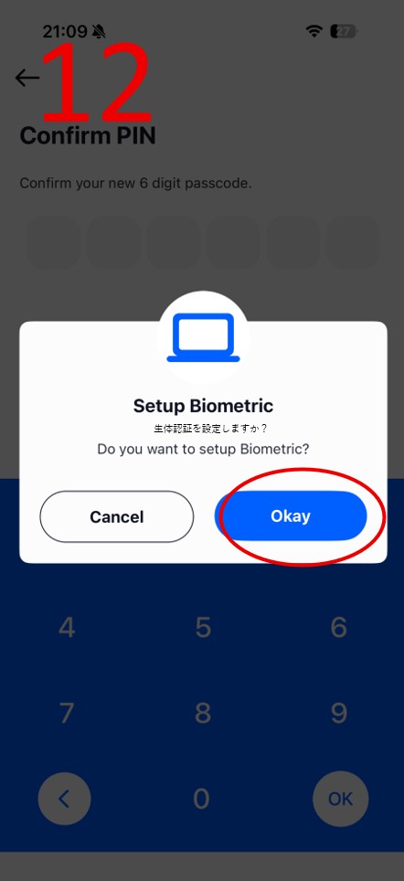12. 生体認証を設定する場合は「Setup Biometric」画面で「Okay」をクリック。スキップする場合、「Cancel」をクリック