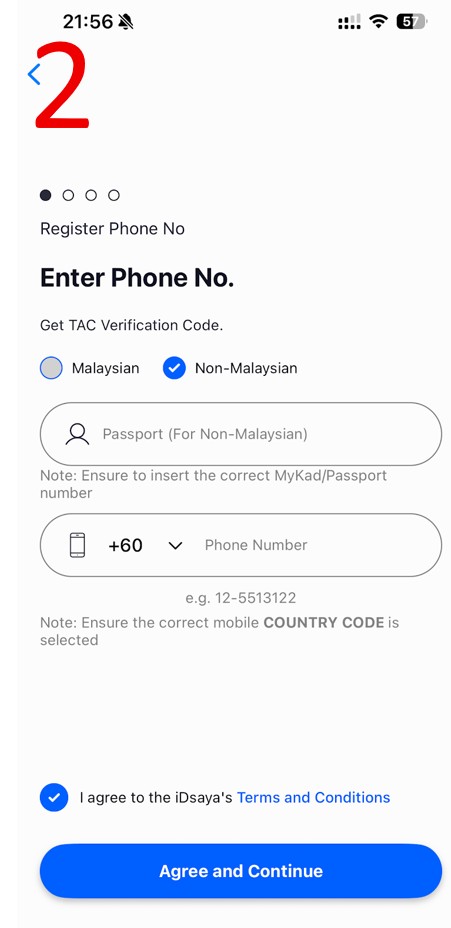 2.「Non-Malaysian」を選択して「Passport(パスポート)」「Phone Number(電話番号)」を入力してください