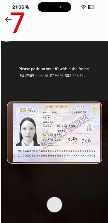 7. パスポートをフレーム内に収まるように配置して写真を撮る