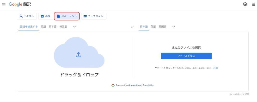 Google翻訳ページから「ドキュメント」タブを選択してファイルをアップロードしてください。