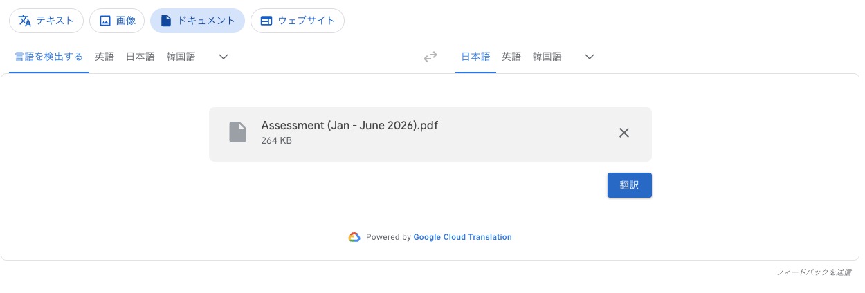 今まではGoogle翻訳サイトでそれぞれの英語ワードをコピー&ペイストなどして各セクションごとに翻訳する必要がありましたが、今は書類丸ごとアップロードすることで全文日本語でPDF出力することができます。
