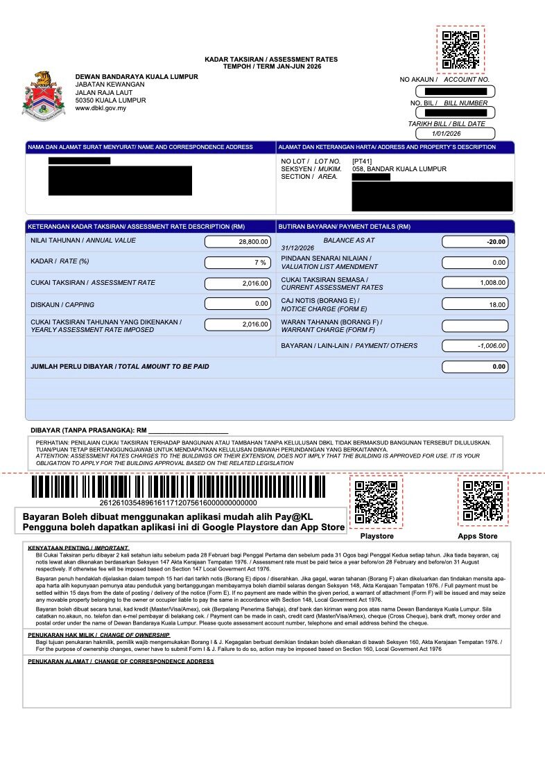 1年に2回支払う固定資産税(Assesment Tax)と1年に1回支払う地代(Quit Rent)は請求書がマレー語や英語が入り混じり分かりづらいので、Google Translateをうまく活用しましょう。