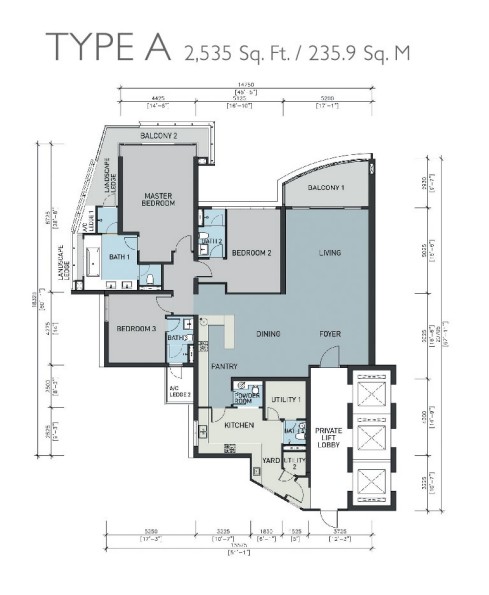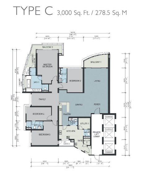 建物は地上40階建てのツインタワー2棟で構成され、永久所有権(フリーホールド)の5.81エーカーの敷地に、合計460戸が建設されています。住戸面積は、3+1ベッドルーム・バスルーム5室タイプが2,535~2,700平方フィート、4+1ベッドルーム・バスルーム5室タイプが3,000平方フィートとなっています。さらに、5,790~6,465平方フィートの広さを誇るペントハウスが6戸用意されています。