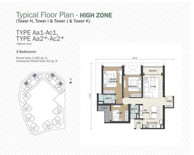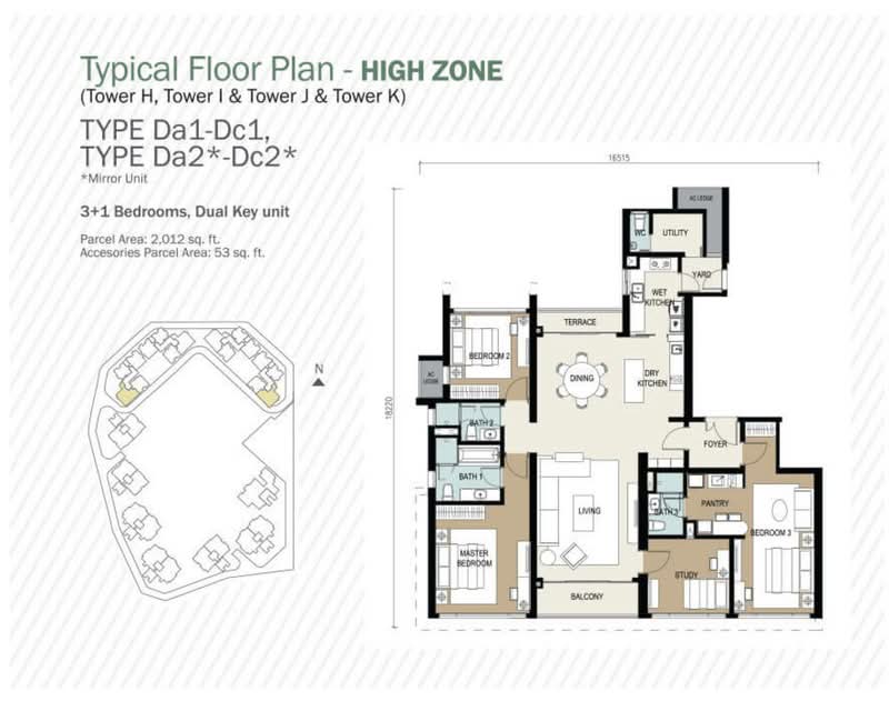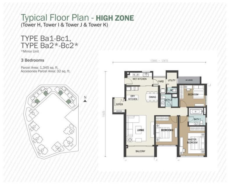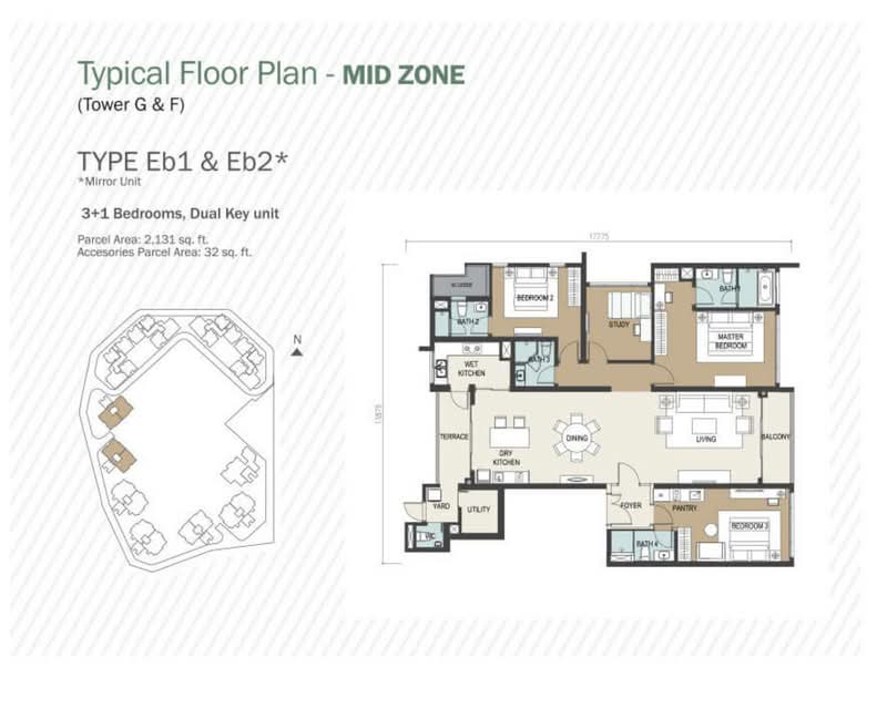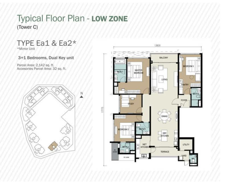 専有面積は約1,162平方フィートから最大5,037平方フィートまで幅広く、販売価格はおよそRM1,179,667からRM6,621,613となっています。間取りはすべて2+1ベッドルームから4+2ベッドルームで構成されており、最大面積の5,037平方フィートのユニットは8階建ての低層棟部分に位置しています。全戸に2台分の駐車場が無償で付帯します。また、24時間警備体制のゲーテッドコミュニティ内にあり、セキュリティ面も充実しています。