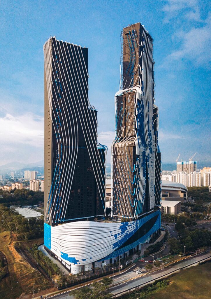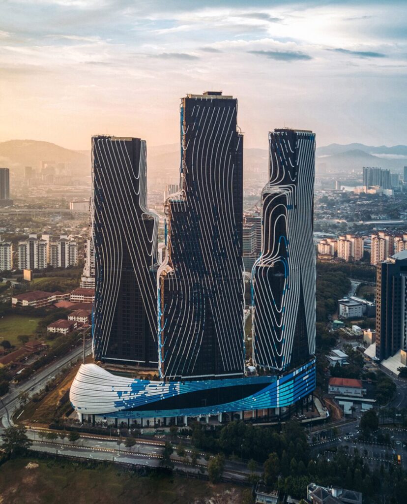 この物件は3.3エーカーの敷地内に最新設備を備えており、なかでもひときわ目を引くのがその革新的なデザインです。3棟ある高層タワーの外観には、開発者であるトーマス・チャン氏の親指の指紋を模したデザインが採用されており、まさに他にはない独創的な建築となっています。さらに、建物全体が“ダンスする”ようにひねりを加えた構造となっており、コルク抜きのようなツイストした形状が特徴的です。