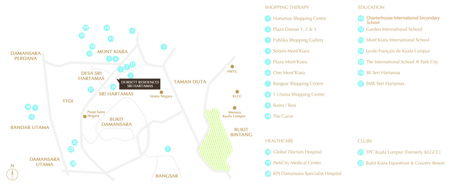 本物件は、モント・キアラ、ハルタマス、ダマンサラ・ハイツ、バンサーといった高級住宅エリアに囲まれた戦略的な立地にあります。また、クアラルンプール市内中心部、TTDI、バンダー・ウタマ、ムティアラ・ダマンサラへも良好なアクセスを誇り、優れた交通利便性を備えています。