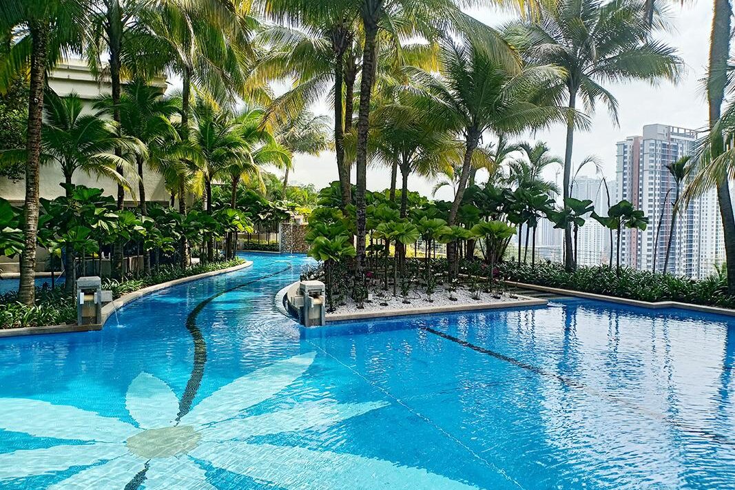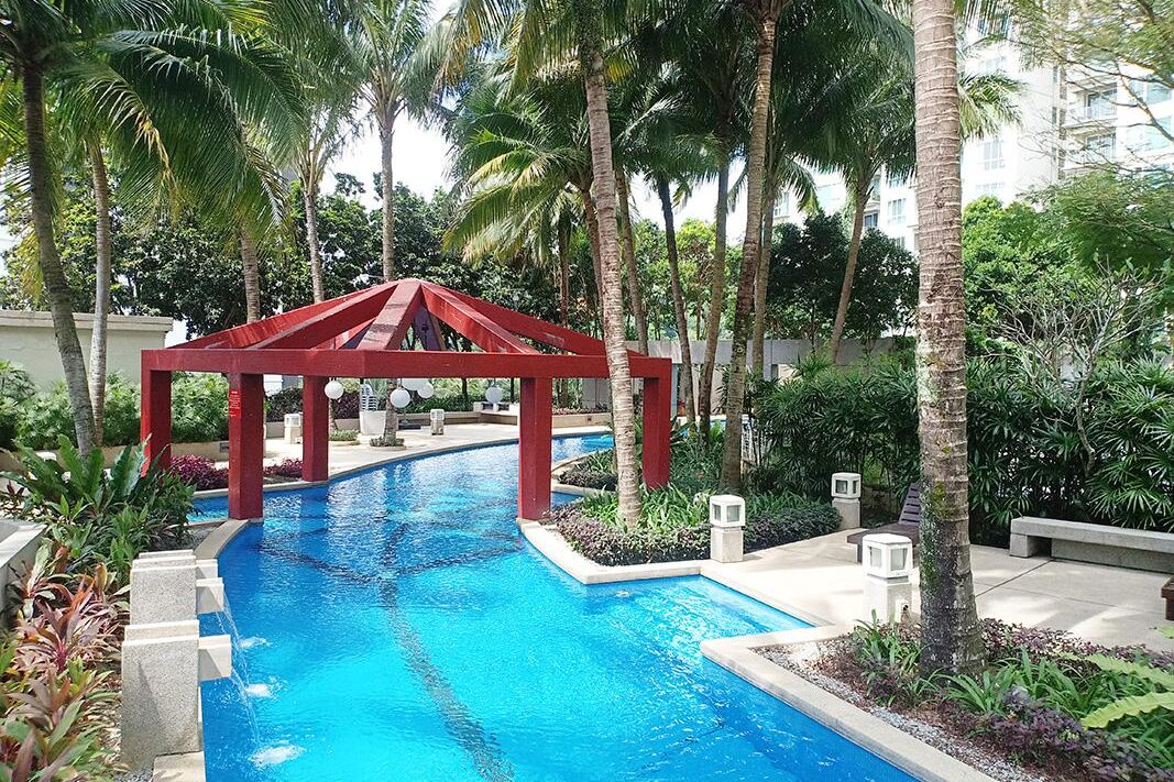 Kiaramas Ayuriaは、レクリエーション施設やランドスケープ、周辺アメニティが充実していることでも知られています。特に象徴的なのが、タワーの周囲を囲む全長約520フィートの曲線状のウォータースケープです。敷地内では水の要素が多く取り入れられており、2つのラッププール、ウォータースライド、ウォーターカスケード、各棟の車寄せ(ポルテ・コシェール)に設置されたウォータースカルプチャーなど、水景を活かしたデザインが特徴です。また、敷地の背後には緑豊かな森林が広がっており、自然に囲まれた落ち着いた環境も魅力となっています。