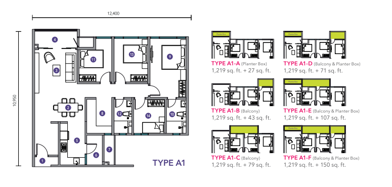 8棟で構成され、主に2タイプの住戸が提供されています。Type A は延床面積 1,219 平方フィート、Type B は 1,403 平方フィートです。購入者は住戸をカスタマイズすることが可能で、バルコニー面積の拡張やプランターボックスの追加など、より個性的な住まいに変更できます。追加面積は Type A で 27〜150 平方フィート、Type B で 31〜122 平方フィートです。