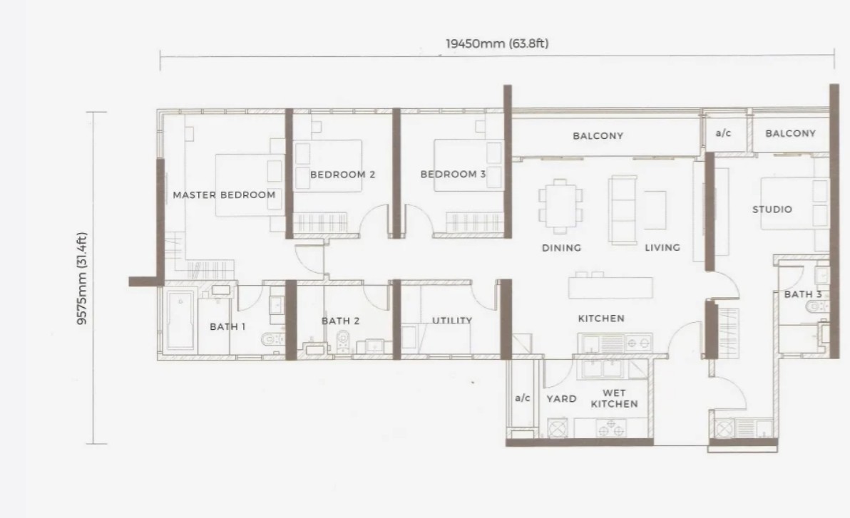 専有面積は約1,122~1,906平方フィートまでのバリエーションがあり、2+1ベッドルームから4+1ベッドルームまでの間取りが用意されています。特徴的なのは、1695平方フィートと1906平方フィートの「デュアルキー」タイプで、3+1ベッドルームに加えて独立したスタジオユニットが付く設計となっており、二世帯同居や一部賃貸運用にも対応可能です。各住戸には2台または3台分の駐車場が割り当てられています。