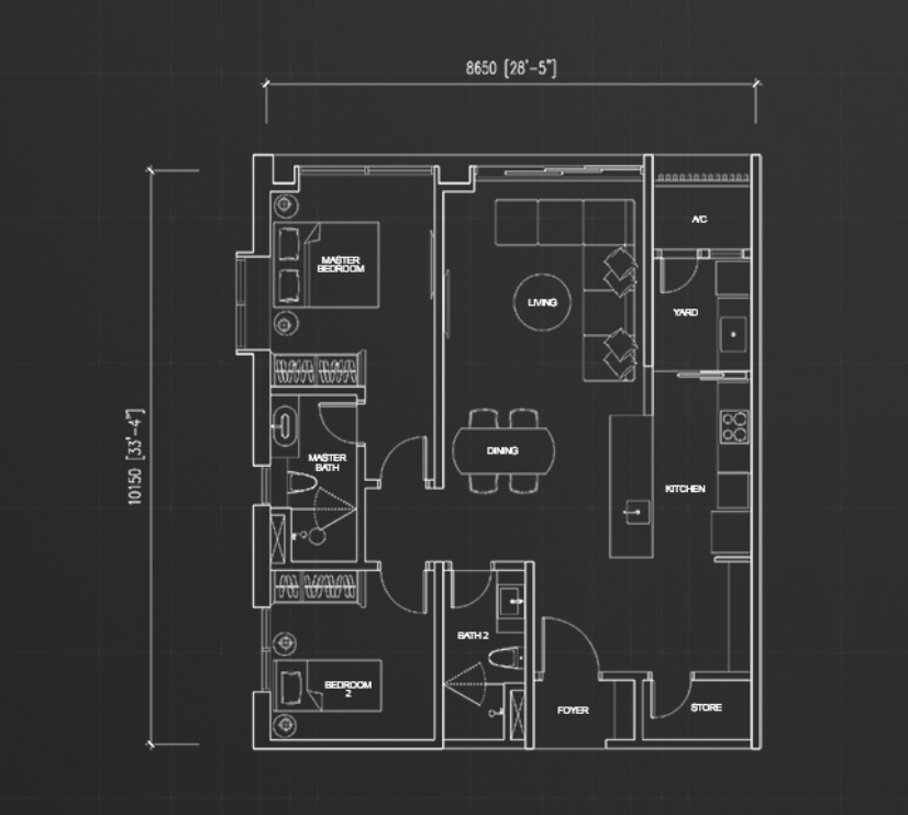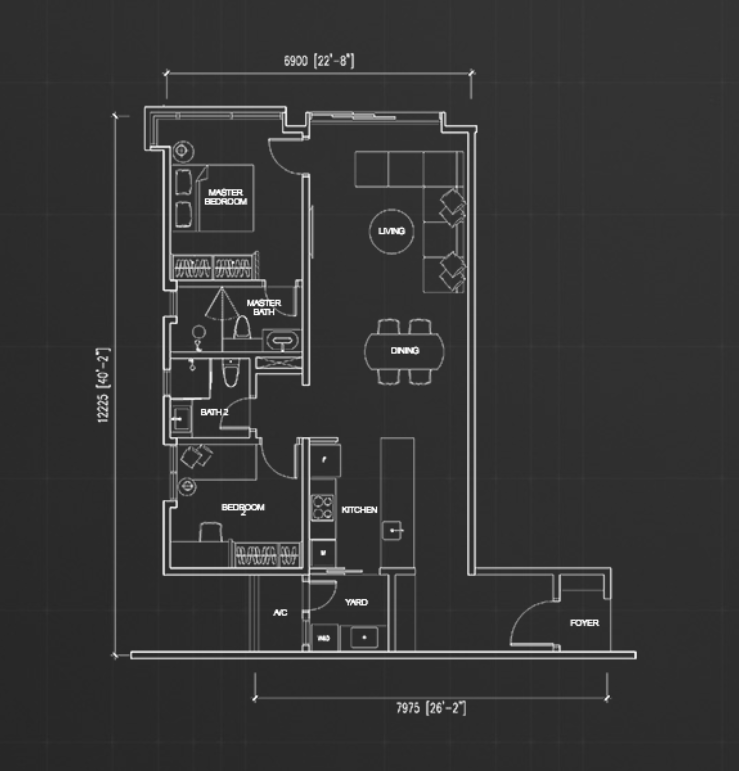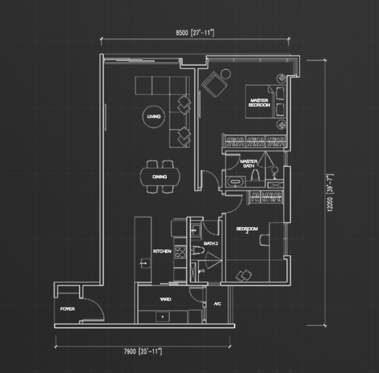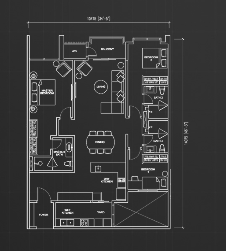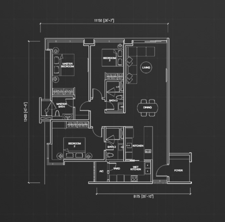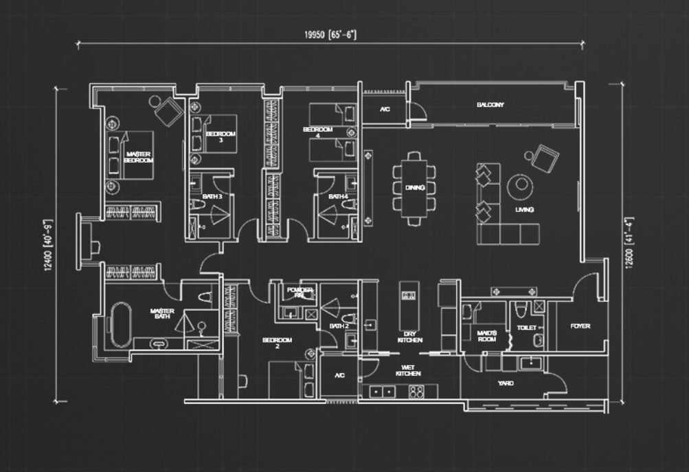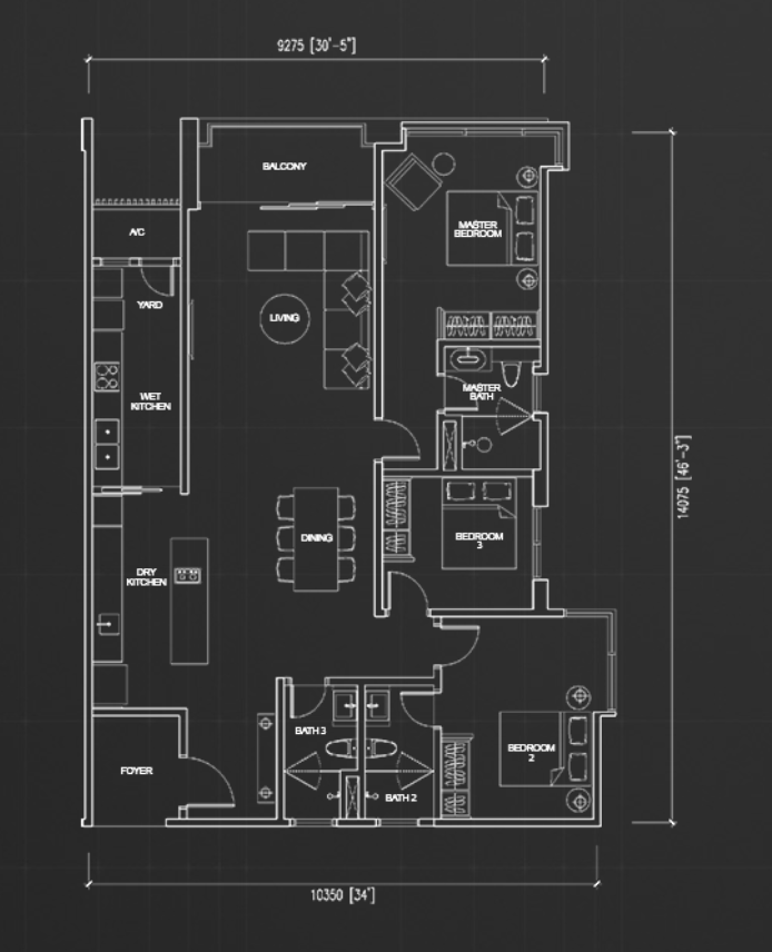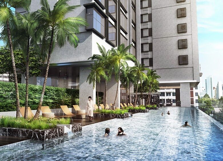 住戸プランはスタジオタイプからペントハウスまで全6タイプが用意されており、最小住戸は約549平方フィート、最大のペントハウスは約3,552平方フィートの広さがあります。居住者向けには充実した共用施設が整備されており、50mプール、バーベキューエリア、プレイグラウンド、人工芝、飛び石、植栽、空中ジム、スチームルーム、サウナ、託児施設、多目的ホールなどが利用可能です。眺望はKLCC(クアラルンプール中心部)方面、またはロイヤル・セランゴール・ゴルフクラブ方面のいずれかを選択できます。